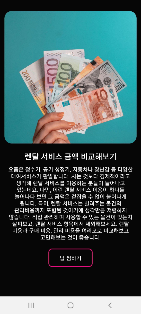 "desc":"요즘은 정수기, 공기 청정기, 자동차나 장난감 등 다양한 대여서비스가 활발합니다. 사는 것보다 경제적이라고 생각해 렌탈 서비스를 이용하는 분들이 늘어나고 있는데요. 다만, 이런 렌탈 서비스 이용이 하나둘 늘어나다 보면 그 금액은 겉잡을 수 없이 불어나게 됩니다. 특히, 렌탈 서비스는 빌려주는 물건의 관리비용까지 포함된 것이기에 생각만큼 저렴하지 않습니다. 직접 관리하며 사용할 수 있는 물건이 있는지 살펴보고, 렌탈 서비스 항목에서 제외해보세요. 렌탈 비용과 구매 비용, 관리 비용을 여러모로 비교해보고 고민해보는 것이 좋습니다. ",